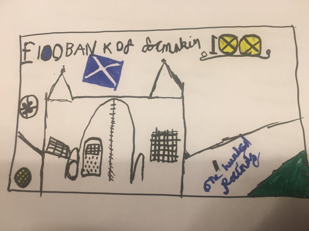 Here is a photo of my own bank note. It’s called the Bank of Formakin because it is where we live. It is £100 note.