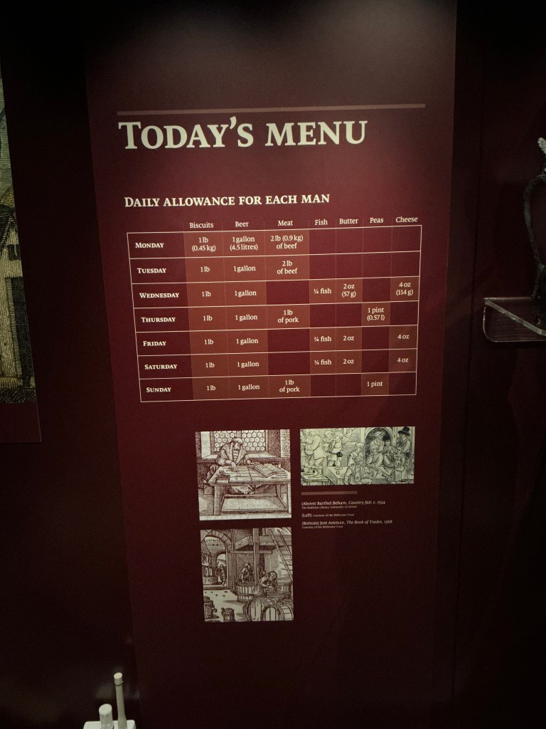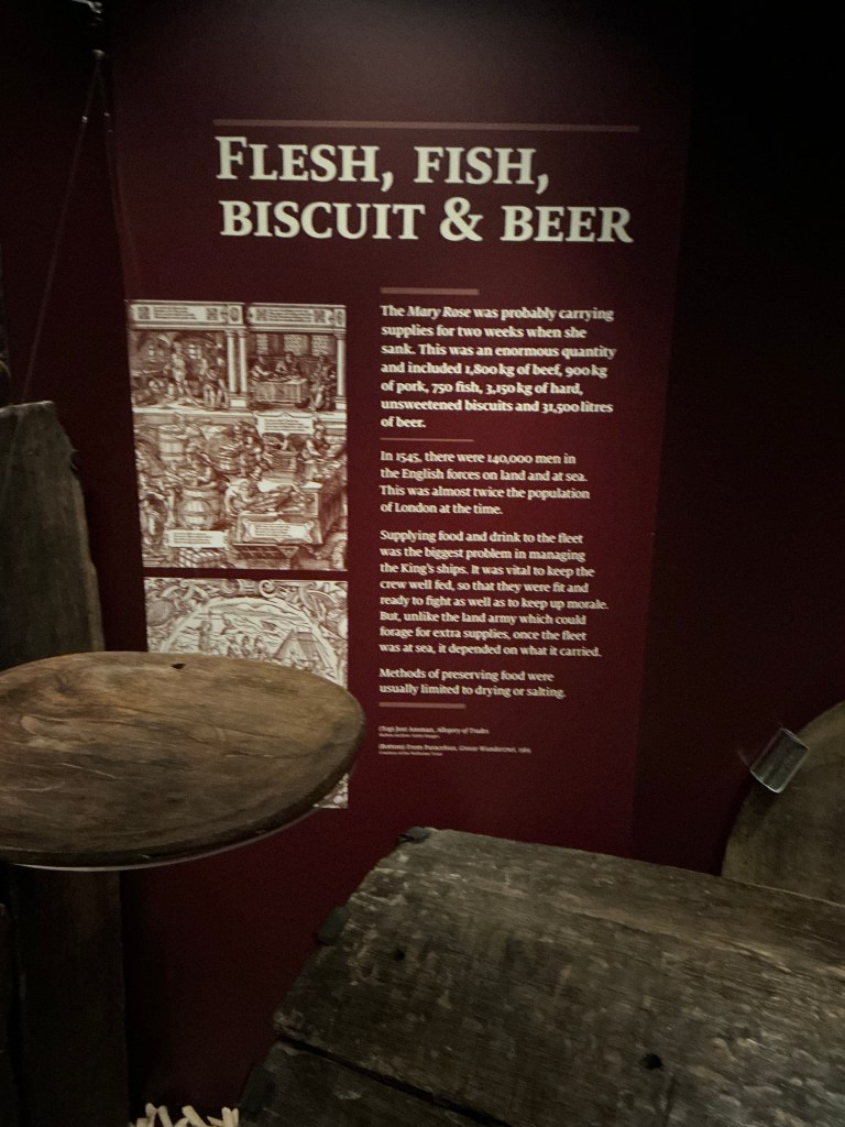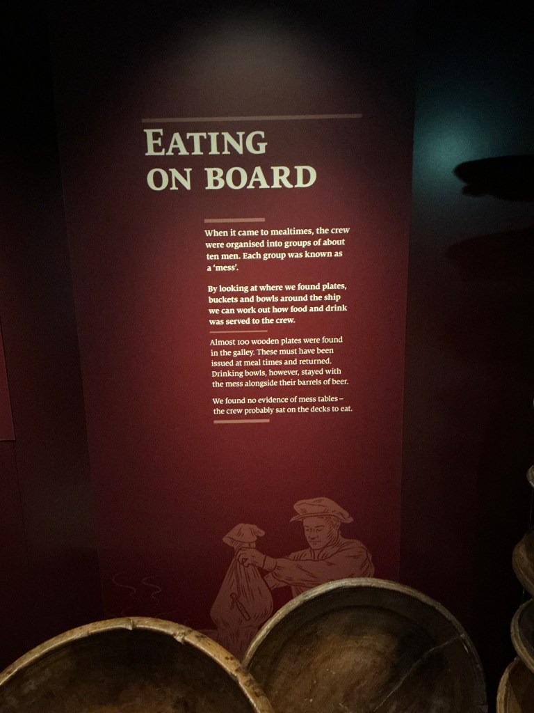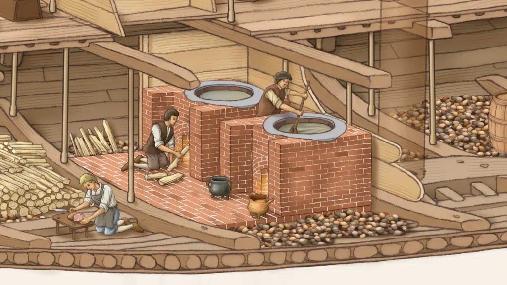 The ship’s galley was in the very bottom of the ship, in the hold. It was made of brick with a huge stew pot above the fire in the brick kiln. Only one of these pots survived due to the way the Mary Rose sat underwater.