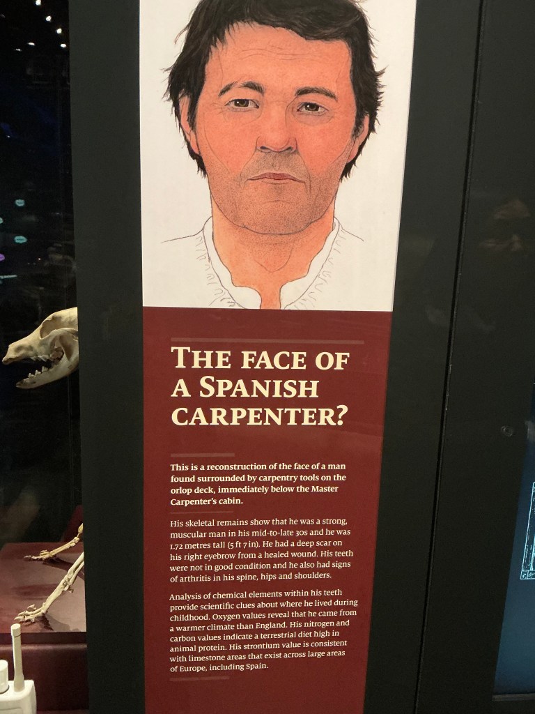 The skeleton of a carpenter was found directly below the Master Carpenter’s Cabin on the Orlop Deck. His remains show that he was strong man and was in his 30s when he died. He was 1m72cm tall and he had arthritis because there were signs in his spine, hips and shoulders.