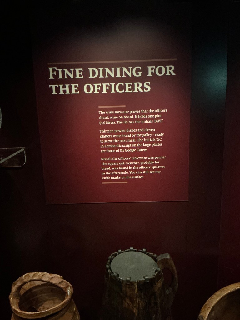 The officers had a wine measure to share out the wine. It held one pint and it had a lid with BWE on it. Thirteen pewter dishes and 11 plates were found to serve the next meal in the wreck.